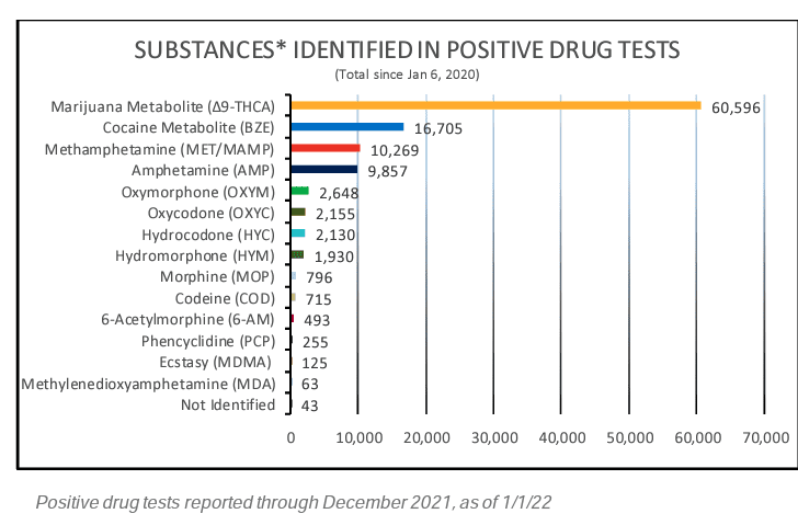 Of the 58,215 drug violations reported last year, 49,019 were due to a positive drug test result. Another 8,152 resulted from drug test refusals.
